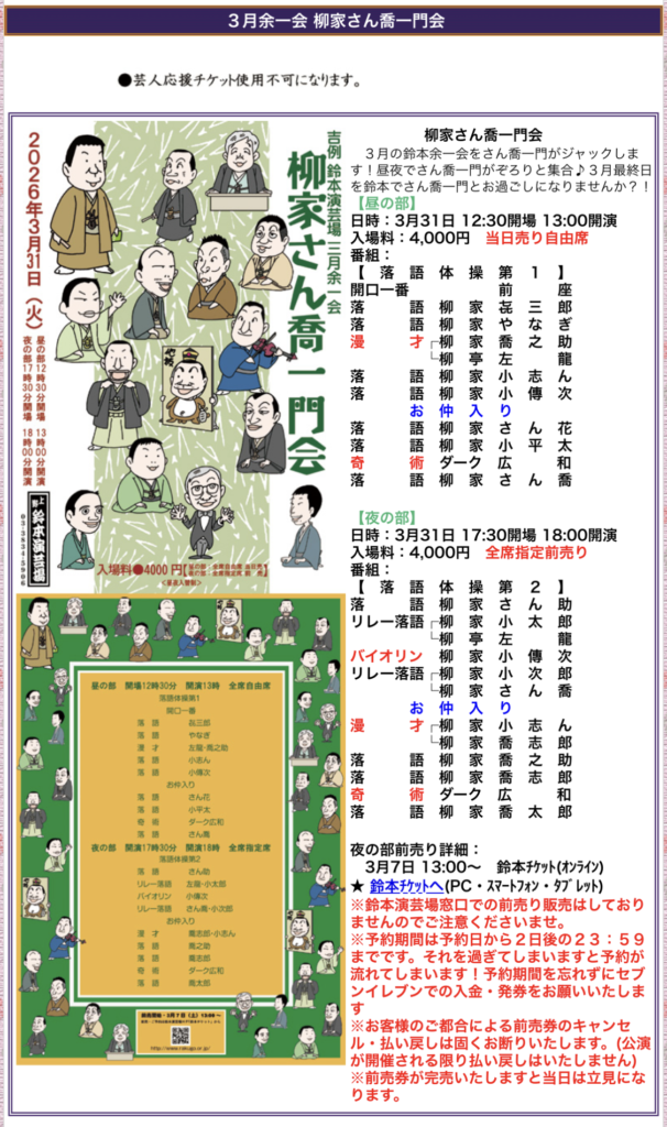 上野鈴本演芸場 3月余一会 柳家さん喬一門会 3月31日(火) 2026 2/23 2026/3 出演情報 3月余一会 柳家さん喬一門会 2026/3 出演情報 よかったらシェアしてね! URLをコピーしました! 福岡 博多 聖福寺 柳家さん喬 柳家小志ん 3月29日(日) 御茶ノ水 お茶の水駅前寄席 復興キャラバン太陽号 4月14日(火) 関連記事 NHK文化センター さいたまアリーナ教室 柳家小志んのさいたま落語研究会 4/14~6/23 2026年2月23日 第62回 噺+話 おきがる講座と落語会江東モダン亭のコラボ 5月26日(火) 2026年2月23日 王子駅前 王子ひるま寄席5月28日(木) 2026年2月23日 鶴見駅前 鶴見ひるま寄席 5月21日(木) 2026年2月23日 御茶ノ水 お茶の水駅前寄席 復興キャラバン太陽号 5月19日(火) 2026年2月23日 浦和駅前 浦和ひるま寄席 5月1日(金) 2026年2月23日 鶴見駅前 鶴見ひるま寄席 4月23日(木) 2026年2月23日 福岡 博多 聖福寺 柳家さん喬 柳家小志ん 3月29日(日) 2026年2月23日 コメント コメントする コメントをキャンセルコメント ※ 名前 ※ メール ※ サイト 次回のコメントで使用するためブラウザーに自分の名前、メールアドレス、サイトを保存する。