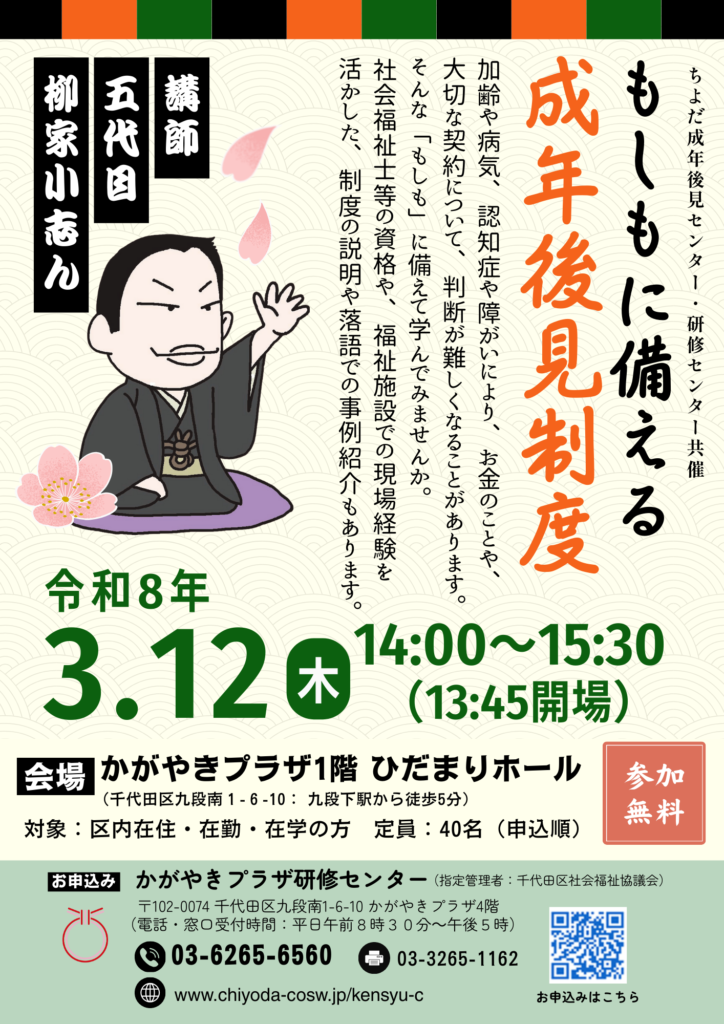 千代田区 「もしもに備える成年後見制度」3月12日(木) 2026 2/23 2026/3 出演情報 2026/3 出演情報 よかったらシェアしてね! URLをコピーしました! 清澄白河駅 雲光院 あおい寄席 3月8日(日) 奈良県葛城市 落語家とゆるっと学ぶ成年後見制度 3月15日(日) 関連記事 NHK文化センター さいたまアリーナ教室 柳家小志んのさいたま落語研究会 4/14~6/23 2026年2月23日 第62回 噺+話 おきがる講座と落語会江東モダン亭のコラボ 5月26日(火) 2026年2月23日 王子駅前 王子ひるま寄席5月28日(木) 2026年2月23日 鶴見駅前 鶴見ひるま寄席 5月21日(木) 2026年2月23日 御茶ノ水 お茶の水駅前寄席 復興キャラバン太陽号 5月19日(火) 2026年2月23日 浦和駅前 浦和ひるま寄席 5月1日(金) 2026年2月23日 鶴見駅前 鶴見ひるま寄席 4月23日(木) 2026年2月23日 上野鈴本演芸場 3月余一会 柳家さん喬一門会 3月31日(火) 2026年2月23日 コメント コメントする コメントをキャンセルコメント ※ 名前 ※ メール ※ サイト 次回のコメントで使用するためブラウザーに自分の名前、メールアドレス、サイトを保存する。