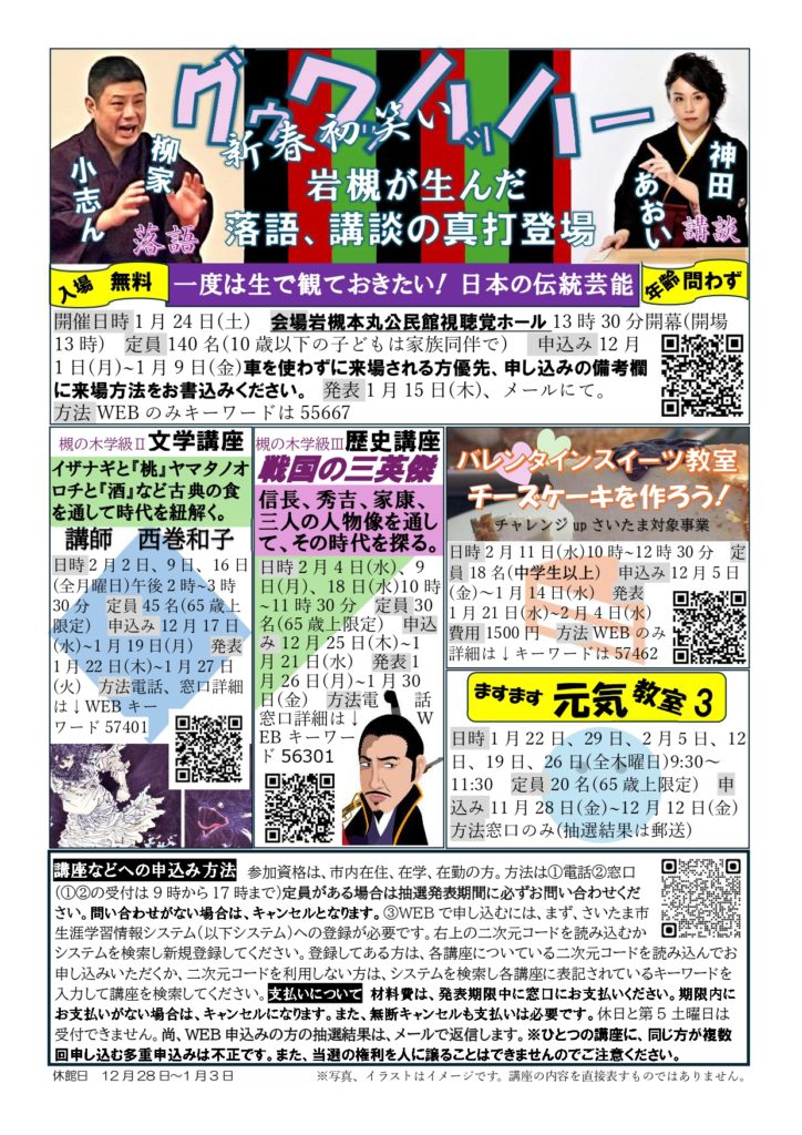 岩槻本丸公民館 1月24日(土) 2025 12/21 2026/01 出演情報 目次新春初笑い 落語講談 人権講座 岩槻区内公民館5館共催 岩槻が生んだ落語、講談の真打登場! 柳家小志ん 神田あおい 1月24日(土) 13時30分開幕(開場13時) 会場 岩槻本丸公民館 視聴覚ホール 定員140名 2026/01 出演情報 よかったらシェアしてね! URLをコピーしました! 深川ひるま寄席 1月20日(火) 第62回 噺+話 おきがる講座と落語会江東モダン亭のコラボ 1月27日(火) 関連記事 1月18日 黒門亭 2026年1月11日 詳細決定!!第3回 五代目 柳家小志ん独演会深川江戸資料館 (清澄白河駅)2026年4月29日(祝・水) 2025年12月13日 鶴見ひるま寄席 2月27日(金) 2025年12月22日 第四回 開催決定!!新橋 寿司 かね正 〜老舗で味わう 落語の夕べ〜2月20日(金) 2025年12月18日 浦和ひるま寄席 3月26日(木) 2025年12月23日 御茶ノ水 お茶の水駅前寄席 復興キャラバン太陽号 3月24日(火) 2025年12月23日 深川ひるま寄席 3月17日(火) 2025年12月23日 深川ひるま寄席 2月19日(木) 2025年12月22日 コメント コメントする コメントをキャンセルコメント ※ 名前 ※ メール ※ サイト 次回のコメントで使用するためブラウザーに自分の名前、メールアドレス、サイトを保存する。