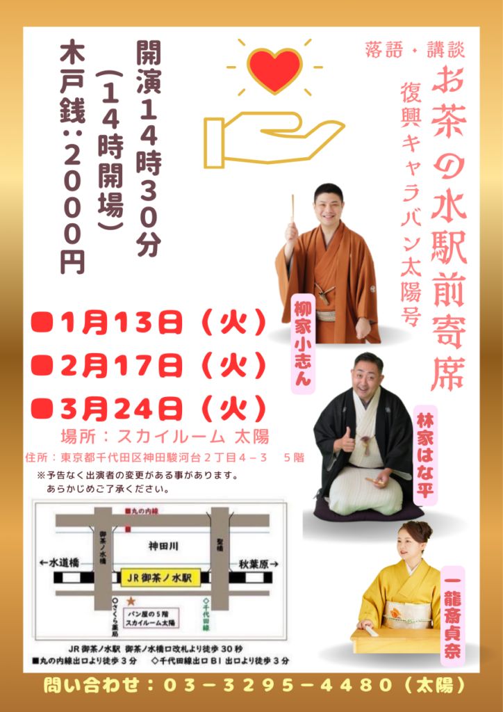 御茶ノ水 お茶の水駅前寄席 復興キャラバン太陽号 2月17日(火) 2025 12/23 2026/2 ひるま寄席 出演情報 柳家小志ん 林家はな平 一龍斎貞奈 スカイルーム太陽 最寄り駅 お茶の水開場 14:00 開演 14:30 木戸銭 2,000円 スカイルーム太陽の地図はこちら… 2026/2 ひるま寄席 出演情報 よかったらシェアしてね! URLをコピーしました! 三浦市 2月15日(日) 深川ひるま寄席 2月19日(木) 関連記事 1月18日 黒門亭 2026年1月11日 詳細決定!!第3回 五代目 柳家小志ん独演会深川江戸資料館 (清澄白河駅)2026年4月29日(祝・水) 2025年12月13日 鶴見ひるま寄席 2月27日(金) 2025年12月22日 駒込 2月22日(日) (clause) 2025年12月22日 第四回 開催決定!!新橋 寿司 かね正 〜老舗で味わう 落語の夕べ〜2月20日(金) 2025年12月18日 浦和ひるま寄席 3月26日(木) 2025年12月23日 御茶ノ水 お茶の水駅前寄席 復興キャラバン太陽号 3月24日(火) 2025年12月23日 深川ひるま寄席 3月17日(火) 2025年12月23日 コメント コメントする コメントをキャンセルコメント ※ 名前 ※ メール ※ サイト 次回のコメントで使用するためブラウザーに自分の名前、メールアドレス、サイトを保存する。