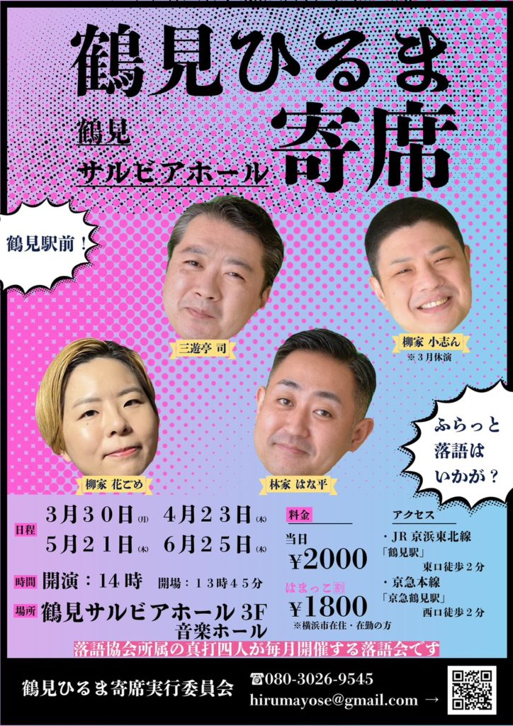 鶴見駅前 鶴見ひるま寄席 5月21日(木) 2026 2/23 2025/5 ひるま寄席 出演情報 三遊亭司 柳家小志ん 林家はな平 柳家花ごめ 鶴見区民文化センター サルビアホール3F/音楽ホール 最寄駅鶴見開場 13:45 開演 14:00 木戸銭 2,000横浜市在住割 2000円→1800円 2025/5 ひるま寄席 出演情報 よかったらシェアしてね! URLをコピーしました! 御茶ノ水 お茶の水駅前寄席 復興キャラバン太陽号 5月19日(火) 王子駅前 王子ひるま寄席5月28日(木) 関連記事 NHK文化センター さいたまアリーナ教室 柳家小志んのさいたま落語研究会 4/14~6/23 2026年2月23日 第62回 噺+話 おきがる講座と落語会江東モダン亭のコラボ 5月26日(火) 2026年2月23日 王子駅前 王子ひるま寄席5月28日(木) 2026年2月23日 御茶ノ水 お茶の水駅前寄席 復興キャラバン太陽号 5月19日(火) 2026年2月23日 浦和駅前 浦和ひるま寄席 5月1日(金) 2026年2月23日 鶴見駅前 鶴見ひるま寄席 4月23日(木) 2026年2月23日 御茶ノ水 お茶の水駅前寄席 復興キャラバン太陽号 4月14日(火) 2026年2月23日 上野鈴本演芸場 3月余一会 柳家さん喬一門会 3月31日(火) 2026年2月23日 コメント コメントする コメントをキャンセルコメント ※ 名前 ※ メール ※ サイト 次回のコメントで使用するためブラウザーに自分の名前、メールアドレス、サイトを保存する。