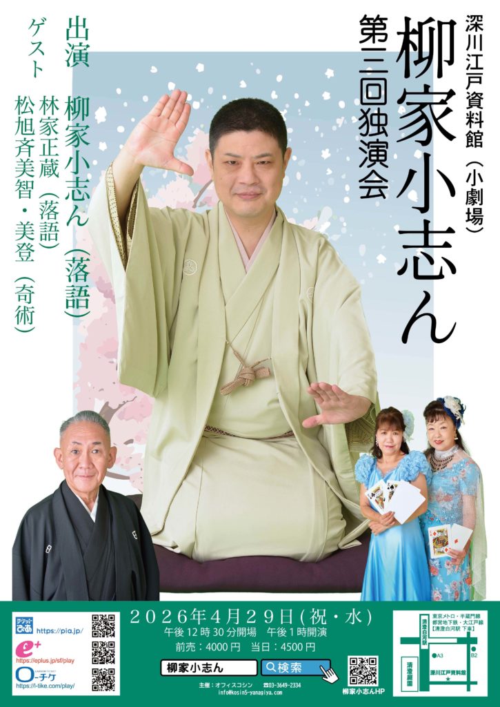 詳細決定!!第3回 五代目 柳家小志ん独演会深川江戸資料館 (清澄白河駅)2026年4月29日(祝・水)